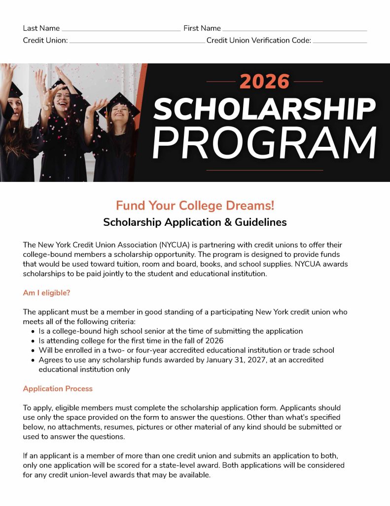 The New York Credit Union Association (NYCUA) is partnering with credit unions to offer their college-bound members a scholarship opportunity. The program is designed to provide funds that would be used toward tuition, room and board, books, and school supplies. NYCUA awards scholarships to be paid jointly to the student and educational institution.
